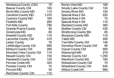 Pincher Creek, Coaldale, Taber and north to Vauxhall) and southeastern Alberta (Medicine Hat and north to Duchess, Rosemary and Gem).