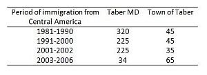 The following table shows the number of immigrants from Central America (including Mexico) to the MD of Taber over four different time periods.