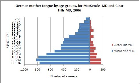The following graph shows the age distributions of persons with German mother tongue in Mackenzie MD in the very northwest corner of the province (most of them