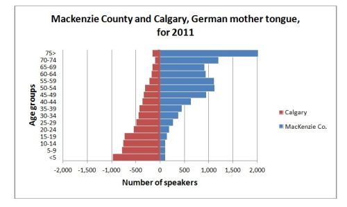 The following graph uses 2011 census data to show the number and distribution of persons with German mother tongue in Mackenzie County and in Calgary. It illustrates what is likely to happen with German as a mother tongue in Alberta.