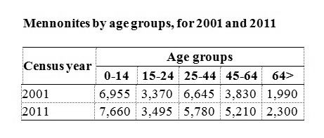 According to the 2001 Census, almost one third of Alberta's Mennonites were children below the age of 15; another 15% ranged in age between 15 and 24. Ten years later, the age distribution for young Mennonites displayed the same percentages.