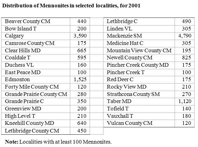in the cities like Calgary (3,590) and Edmonton (1,525), but were otherwise spread out over the entire province (see table below). Large numbers of mostly conservative Mennonites