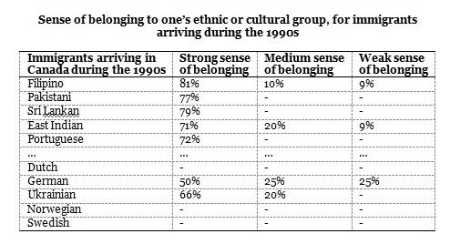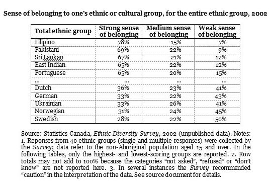 Scandinavians. The following table shows the strong sense of belonging to their ethnic or cultural group displayed by the more recent immigrant groups from Asia: