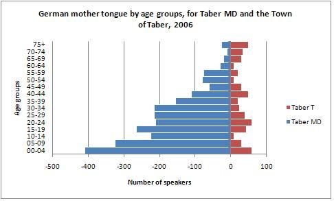 Mennonites only. The following graph displays distributions in the MD of Taber and the Town of Taber. While the MD shows the typical distribution of German mother tongue speakers,