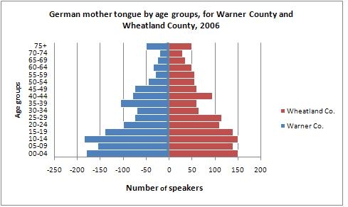 the age of 5 and another 160 between five and nine years of age who had German as their mother tongue; the higher age brackets form a pyramidal shape with relatively few older