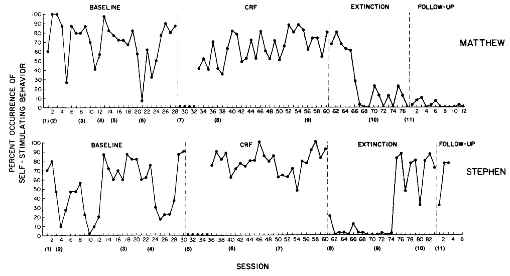 - target behaviour: stereotypic hand flapping (Matthew), finger flicking (Stephen)