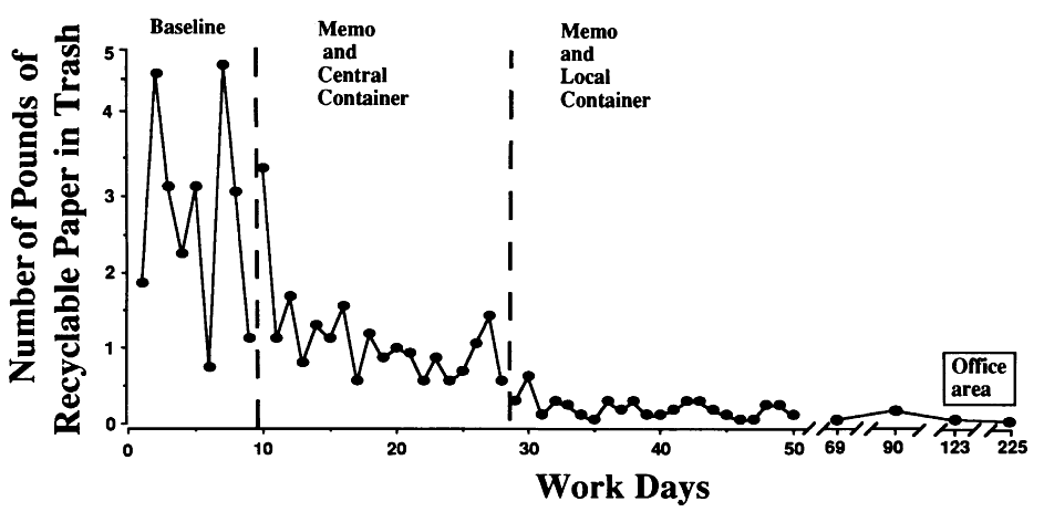 • high response effort condition: recyclable paper in the trash was 40% lower than baseline