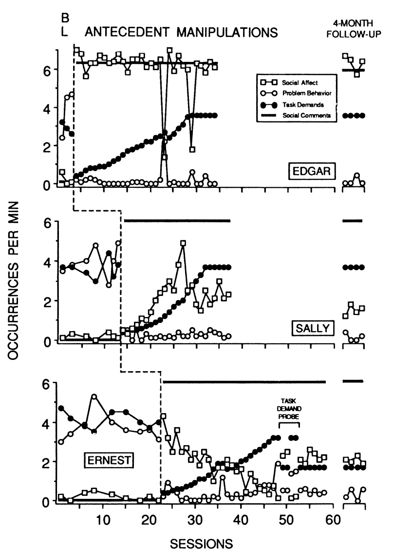 - functional assessment revealed that problem behaviours occurred when teachers made task demands (e.g., putting away dishes, stacking chairs) at high rates (4 per minute), but not for task demands at low rates (one per 2.5 minutes) or social comments