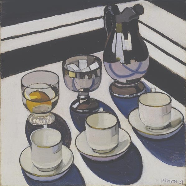e.g., Implement Blue (Margaret Preston, 1927): lemon in water is not distorted