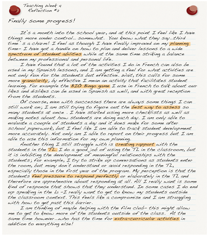 | Reflection 2: Third Year's a charm! | One month into the school year (early October) | After three years of teaching Marguerite feels as though she is getting a handle on her classes. |