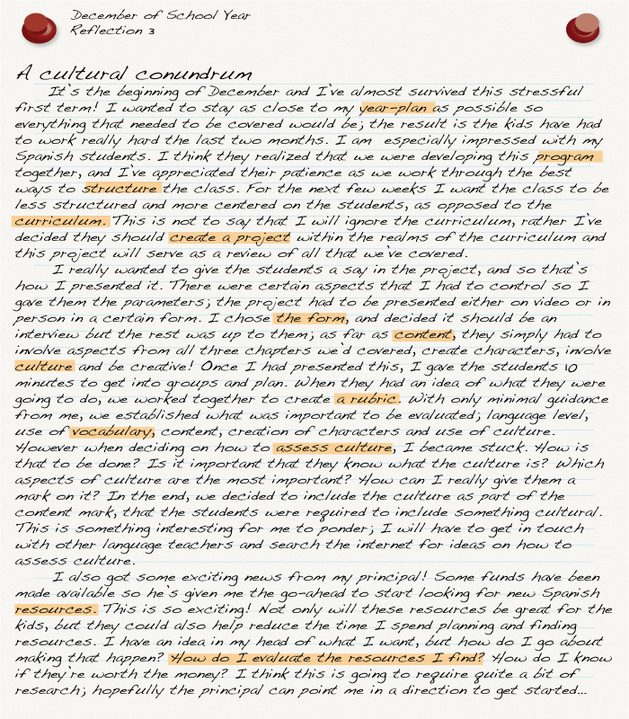 | Reflection 3: Culture Conundrum | End of term (December of school year) | Marguerite starts to feel caught up but faces new issues when creating a project and trying to assess culture. |