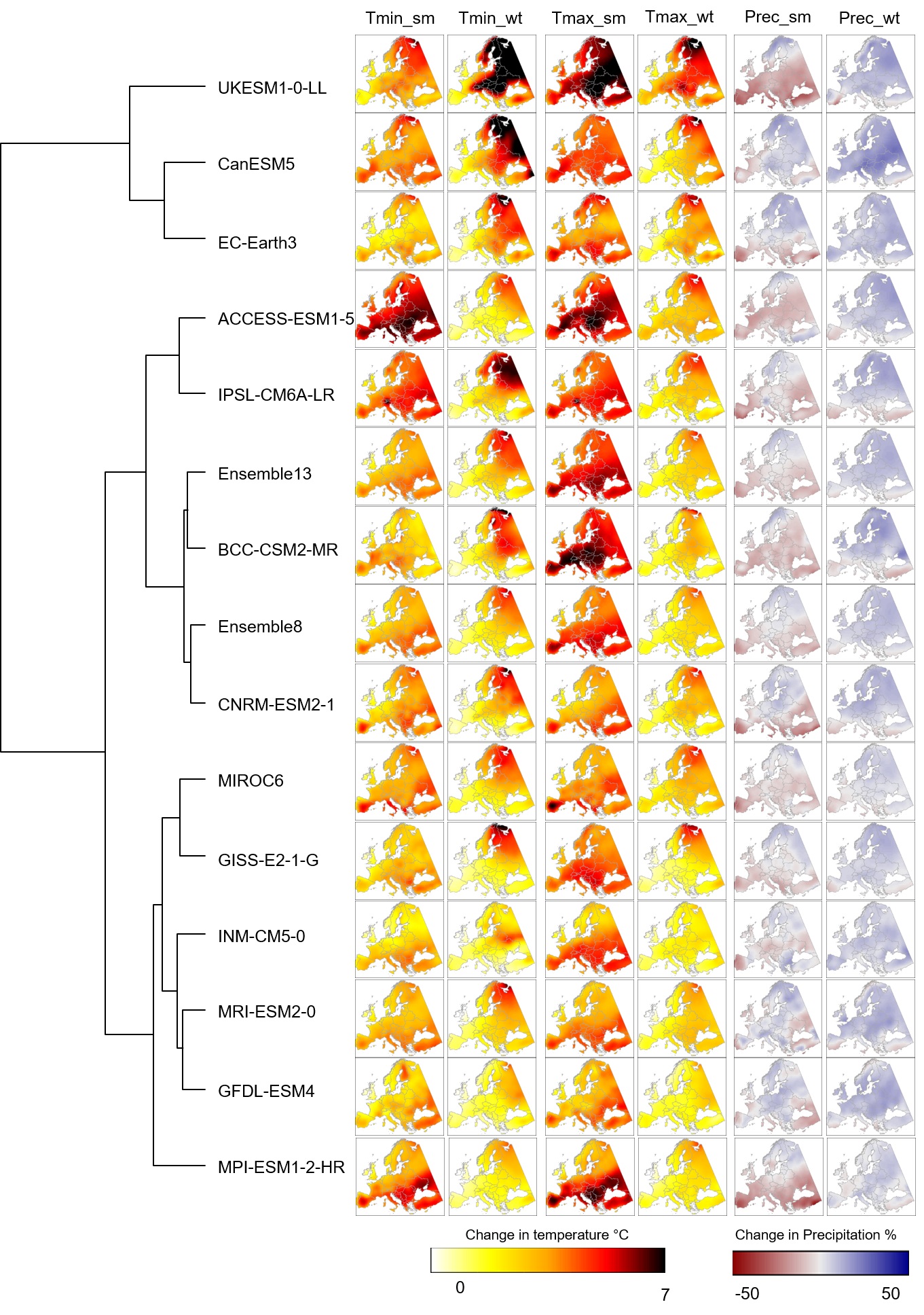 A common approach is to select a median, a pessimistic and an optimistic projection, i.e., a subset size of 3. For example, to assess uncertainty in the United Kingdom and Irlend region (uk/ie) with a 3-model ensemble, you would choose the models: CNRM (median), ACC (pessimistic), and MPI (optimistic) from the table below (compare with the dendrogram above). Adding additional models (rows 4 to 8) will provide increasingly better representation of uncertainty in future predictions in multivariate space.