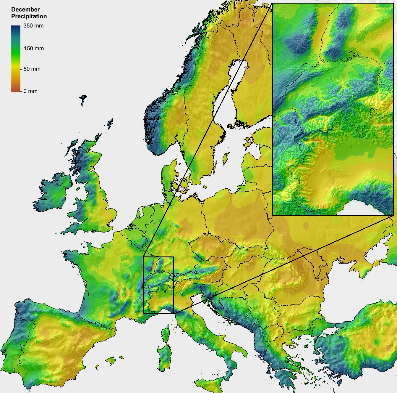 ) to see a higher resolution version, with the inset showing precipitation induced by orographic lift and rain shadows in the Alps region.
