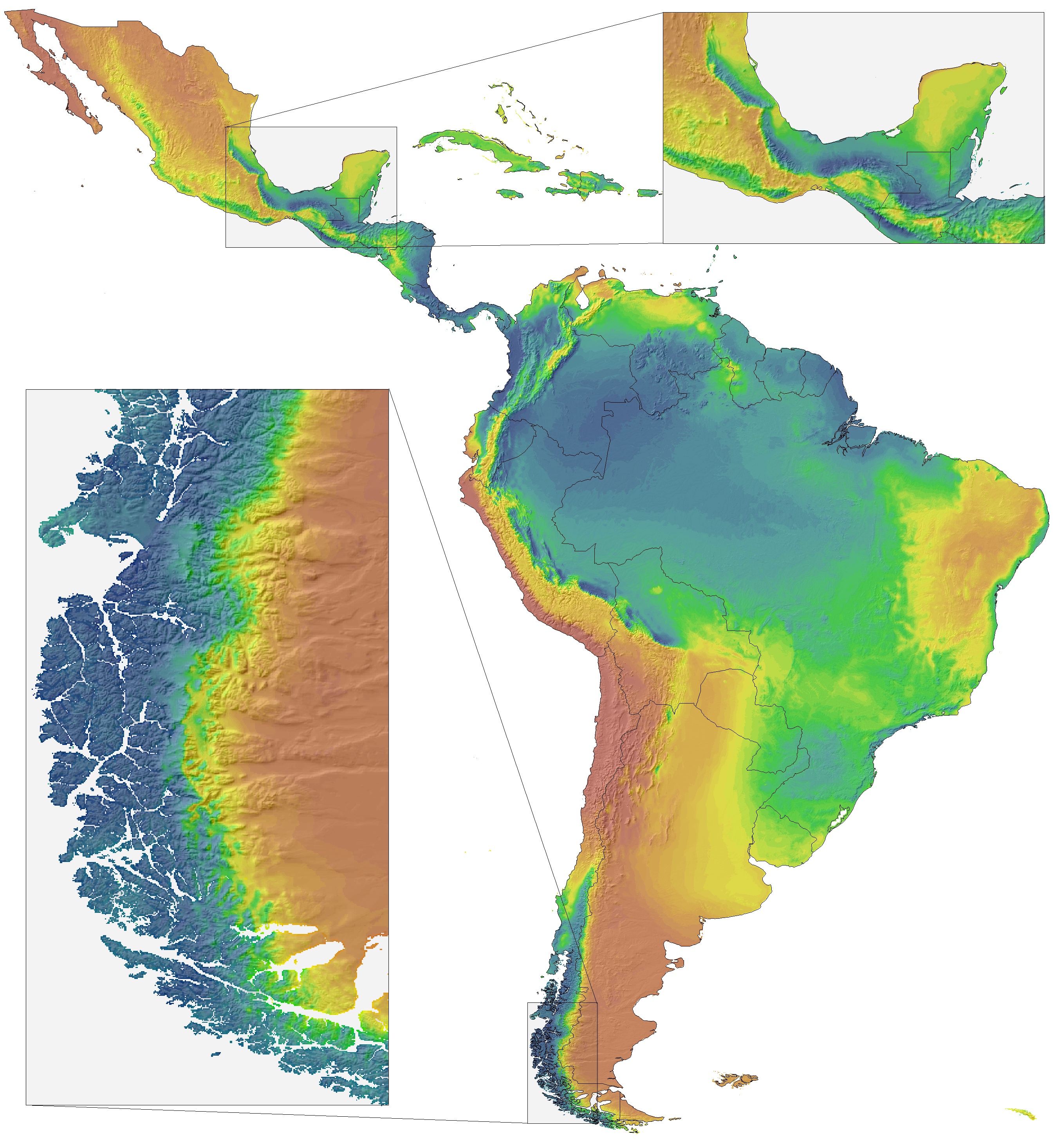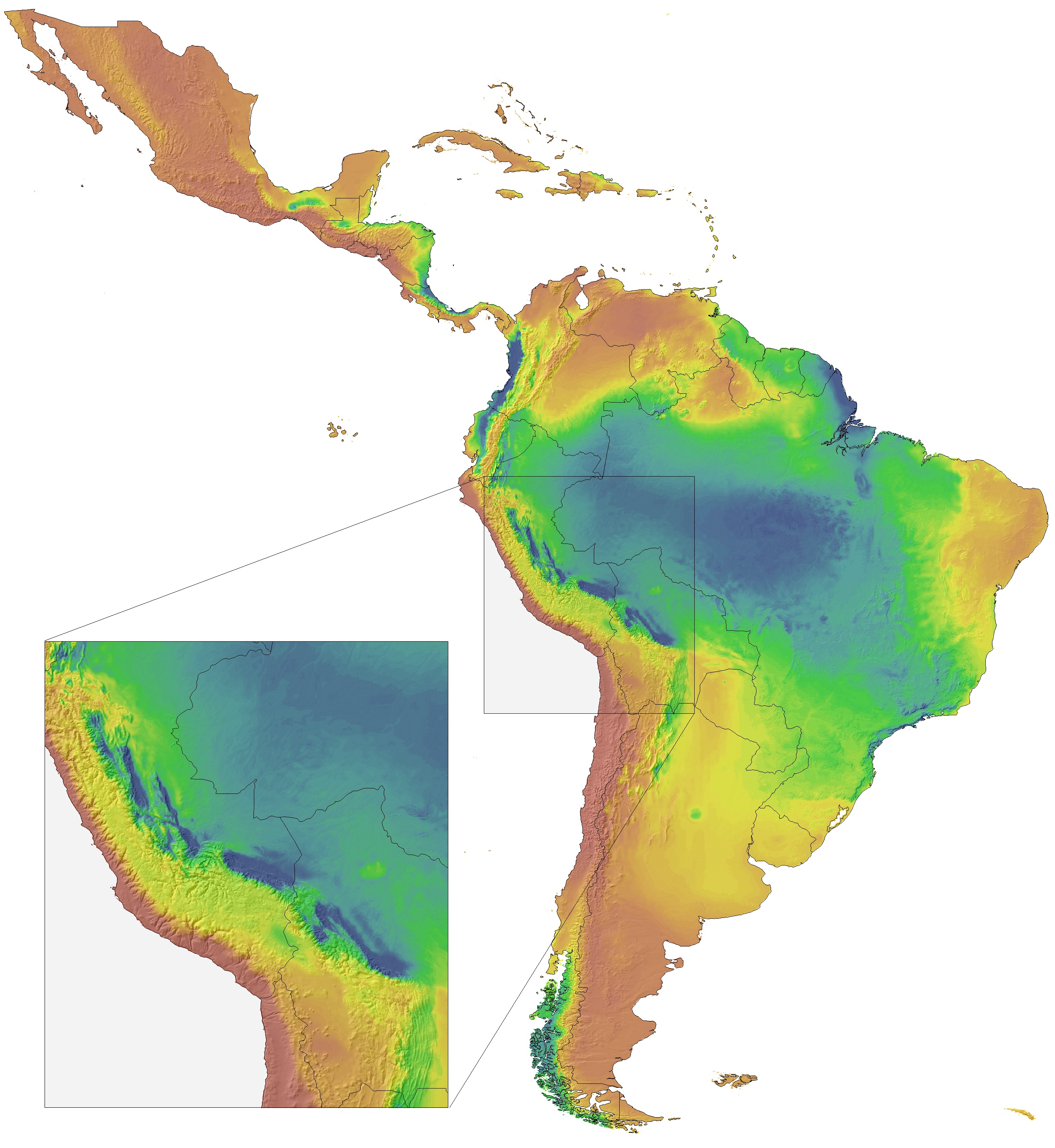 Subsequently, the ClimateSA software downscales the grids to higher resolutions with a digital elevation model in conjunction with local environmental lapse-rates. The software can also provide scale-free point estimates of climate variables for user-provided latitude, longitude and elevation coordinates.