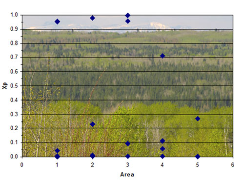 | Distribution of spatial association significance values: Lower significance (Xp) values indicate a greater likelihood that the observed pattern is not due to chance. Area 1=Drayton Valley, 2=Edson North, 3=Edson West, 4=Rocky Mountain House, 5=Whitecourt. |