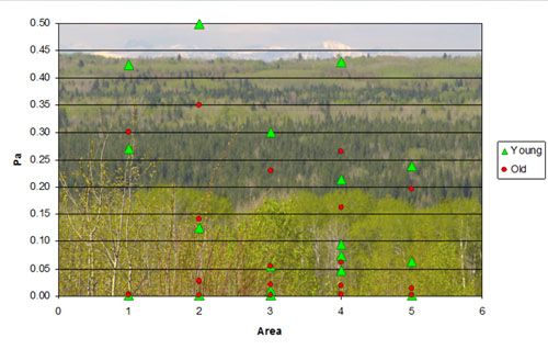 | Distribution of clustering index significance values: Lower significance (Pa) values indicate a greater likelihood that the observed pattern is not due to chance. Area 1=Drayton Valley, 2=Edson North, 3=Edson West, 4=Rocky Mountain House, 5=Whitecourt. |