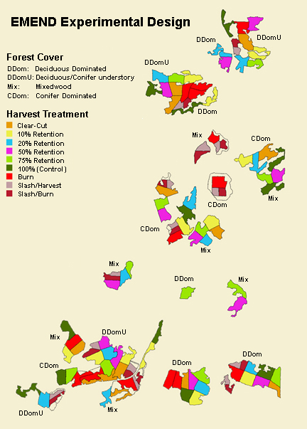 At EMEND, harvesting activities were carried out with the objective to emulate natural disturbances (such as fire). These harvested areas mimic different tree residual patterns (dispersed and clumped retention) distributed in the landscape. As a consequence, five (5) harvesting treatments (dispersed retention) were applied during the winter 1998-1999 as follows: I. 75% retention consist on 5m wide machine corridors spaced 20m apart, leaving 15m wide uncut corridors; II. 50% retention consists on the same harvest pattern but removing additional trees from the uncut corridors at a ratio of 1:2 (removed:standing); III. 20% retention, trees were removed from the uncut corridors at a ratio of 3:4; IV. 10% retention, tress were removed from the uncut corridors at a ratio of 7:8; V. Clear-cut, trees were removed from the whole compartment up to a 2% residual.