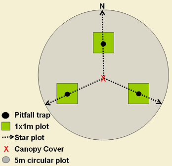 Spiders were collected using pitfall traps. These traps consist on a plastic cup placed inside a cylindrical hole on the ground, the cup is filled up to 1/3 of its volume with a preserving fluid; the upper edge of the cup is leveled off to the ground, allowing invertebrates to fall into the killing agent. A roof like structure is used on top of the trap to reduce rain fall and leaf litter inside the trap. Traps were collected in three-week intervals (4 collections) throughout the summer of 2006. Specimens were sorted and grouped to family in the field; then adults were identified to species in the lab.