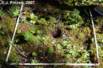 Similarly, plants were sampled on a 1x1m plot during the summer of 2007. Each plot was located in the same area were the pitfall traps operated the previous year, using the trap position as the center point. A 10x10cm cardboard was used to estimate the percentage cover of each individual species inside the plot. Only vascular plants were considered and species were grouped according to their habitus (tree saplings, shrubs, dwarf shrubs & forbs). Using the same method, total percentage cover of moss, leaf/niddle litter, grass, forbs and shrubs was estimated.