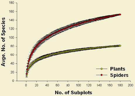 Species area curves for both plant and spider collections were plotted using PC-ORD 5 (McCune & Mefford 2006) to evaluate the suitability of sample size. The average number of species for plants show a tendency to a plateau whereas for spiders tends to continue increasing when reaching 180 subplots (traps). Although this is an indication that sampling effort for spiders was not enough, the data collected is representative for the ground-dwelling assemblage. It can be observed that the accumulation curve seems to start leveling off by the end. In addition, observed species richness (153spp.) correspond in average to more than 80% of estimated richness(ICE: 192 spp., Chao1: 181 spp., Chao2: 184 spp.). These estimations were obtained using EstimateS 7 (Colwell 2006)