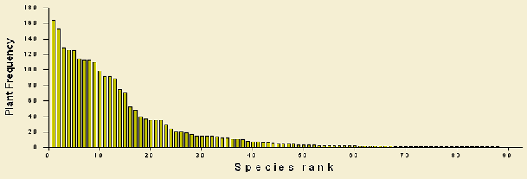 Frequency pots for both plant and species assemblages, show a typical distribution where only few species are very common and a high number of species are found in only few samples. This frequency distribution is strongly skewed to the left and due to the numerous variables associated to each sampling site influencing so many species, multivariate techniques are more suited for analyzing this complex data base. In the Data Analysis section different statistical tools are described.