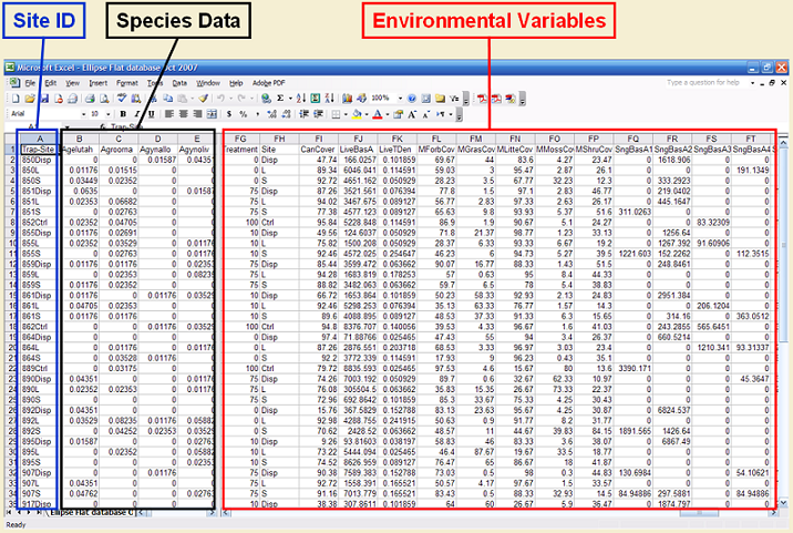 The resulting flat data base contains all the information in the format sites x (species + environmental variables) (rows x columns). Species names were coded for the four first letters of the Genus and Species (Pardosa makenziana = Pardmack). Similarly, all column and raw names were formatted to have only eight characters, thus allowing to be read by different packages. The following image shows and example of this data base: