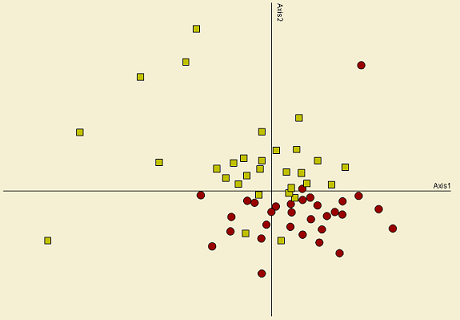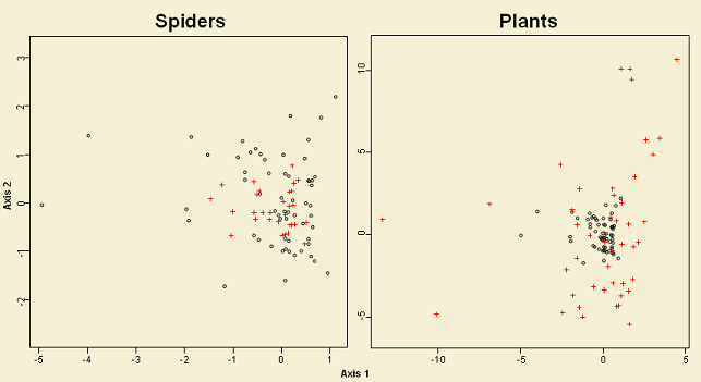 This is the purpose of a Co-Correspondence Analysis (CO-CA). As explained in the Data Analysis section, to perform COCA only the most important species in both assemblages were chosen using MRT. Thus, 30 spider species and 48 plant species were chosen running multiple trees removing species from the most rare ones (lower abundance) to the more common (higher abundance) until obtaining a different tree.