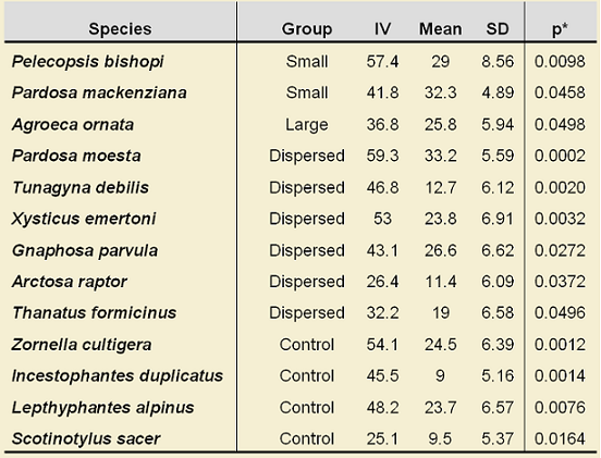 Furthermore, an Indicator Species Analysis (Dufrene & Legendre 1997) was carried out to establish which spider species were more associated to retention classes; thus, 12 species showed a significant (α=0.05) indicator value (IV), although none of these can be considered as strong indicator, since the highest IV was 59% (Table 1). It is interesting to note that all the indicator species for Control areas belong to the family Linyphiidae, while those that are indicator of dispersed retention areas are species commonly found in disturbed areas, such as P. moesta which was not a surprise to be an indicator since, as mentioned before, is probably one of the most abundant and common species after disturbances in the boreal forest. In addition, those species that are indicators for clumped retention (small and large) should be considered as important species; as long as these species are present in retention patches, it might be interpreted that these patches are still functioning as mimics for natural disturbances. Perhaps, increasing the area of these retention patches could improve the number of indicator species and their strength for indication, since larger patches might retain more environmental features that are typical from undisturbed areas.