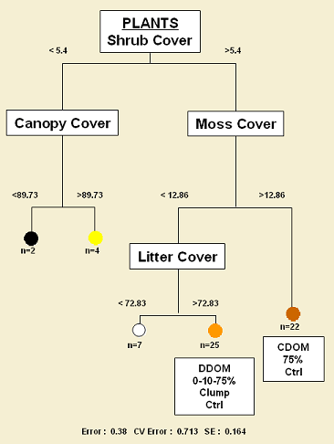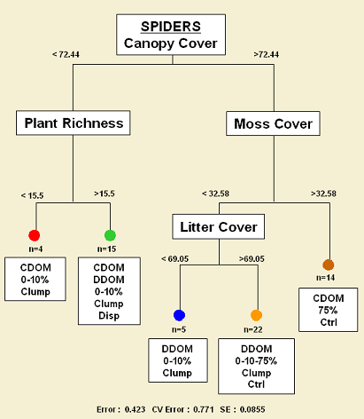 As noted before, Multivariate Regression Trees (MRT) are a very helpful tool to understand how environmental variables are shaping communities. Thus, it is possible to explore, describe and predict relationships between multiple species and variables (De'ath 2002). After running multiple trees, it became evident that some of the environmental variables that were measured did not help to explain differences in ground-dwelling spider and vascular plant assemblages. However, some of these variables seem to be very important to describe species composition variation across the landscape.