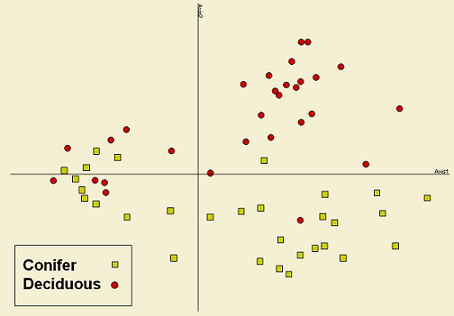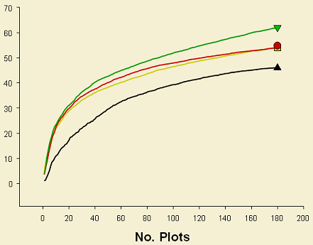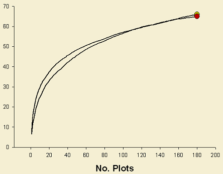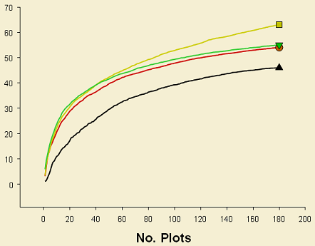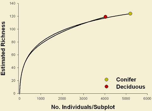 Cover type affects in some degree both the ground-dwelling spider and vascular plant assemblages. Although the difference in species richness between conifer and deciduous forests is not evident (Figure 1). For spiders, under 4000 individuals, about 120 species were recorded in both cover types, showing a slight higher richness in deciduous stands. Similarly for plants, about the same number of species were recorded in both cover types. A large proportion of species for both spiders and plants, were shared between conifer and deciduous stands (90 spider species; 53 plant species). However, 63 spider species were unique in either forest type (34 in conifer and 29 in deciduous) and 25 plant species were unique in either forest type (13 in conifer and 12 in deciduous).