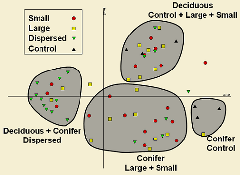 On the other hand, retention class (clumped vs. dispersed) showed a strong effect on the spider assemblage (Figure 6) but not on the plant assemblage (not shown). For clarity in Figure 6, similar sites were surrounded by grey ellipses to show groupings. Thus, dispersed areas of clear-cuts and 10% retention of conifer and deciduous forests cluster distinctively far to the left of the ordination, whereas retained patches were clustered in between dispersed areas (disturbed) and control areas (undisturbed). Although there is no difference between large and small retention patches, it is very interesting that these patches in deciduous forests are very similar in species composition and abundance to controls, whereas in conifer stands, control compartments cluster apart from retention patches.