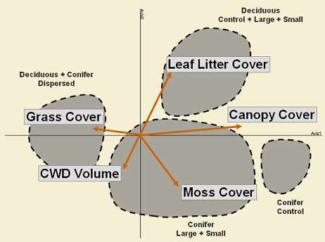 From the different variables that were measured (click here for more details) some showed to affect species composition and abundance of spiders in both disturbed and undisturbed areas of conifer and deciduous forests. Thus, some environmental variables were strongly associated to clusters in the NMS ordination (Figure 7). As a consequence, leaf litter cover, moss cover, grass cover, canopy cover and CWD volume seem to strongly affect ground-dwelling spider assemblages in the boreal forest.