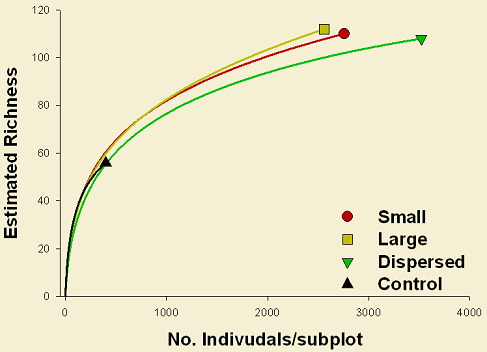 For plants in contrast, only large retention patches showed higher species richness; in small patches and dispersed areas this parameter was similar and lower (Figure 3). In large patches 11 species were unique, whereas the same number of species were unique in both small patches and dispersed areas.