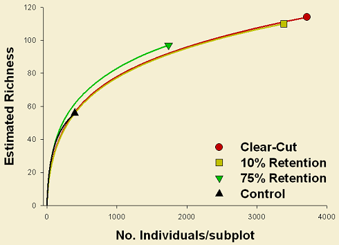 Harvesting treatments seem to have a lower effect on species richness (Figure 2). However, for spiders, under the same number of individuals (ca. 2000 ind.), 75% retention tends to show higher species richness in comparison to 10% retention and clear-cut. Similarly, this same situation is observed for plants. As a consequence these results suggest that there is a relation between richness values and disturbance degree. The higher richness observed in clear-cuts and 10% retention, compared to controls, might be explained by the higher number of open habitat specialists observed in these harvest treatments. As a consequence, 75% retention stands sustain the highest species richness because of the presence of both open and close habitat specialists.
