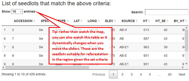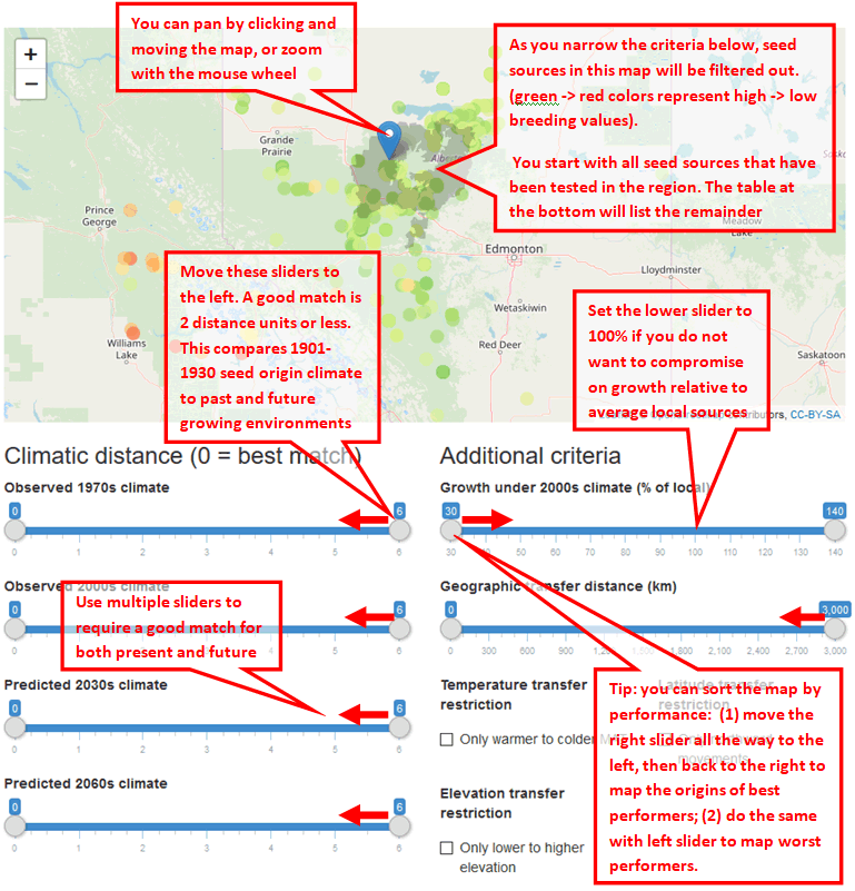 - At the bottom of the page, you can find a table containing details of seed sources shown in the map. This table also dynamically updates as you move the sliders. You can sort the table by clicking on the headers.