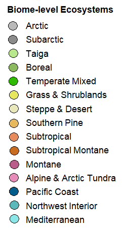To start: Select a target FMA and ecosystem, either from the hierarchical drop-down menu above, or by clicking on a circle marker on the map below (use your mouse and scroll-wheel to zoom and pan). Once you set an ecosystem as target, you can track observed and projected climate change, select appropriate tree species, and see how the area may look like in the future via View links for climatically matching source ecosystems.