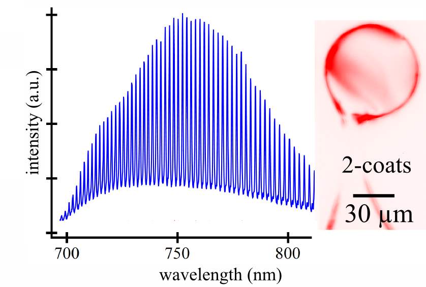 The important thing is that the oscillations in the corresponding luminescence spectrum show Q-factors of several thousand. This is actually very high for a fluorescent microstructure. It is interesting to think that the red light we see emitted from these microspheres is really composed of all those very sharp peaks.