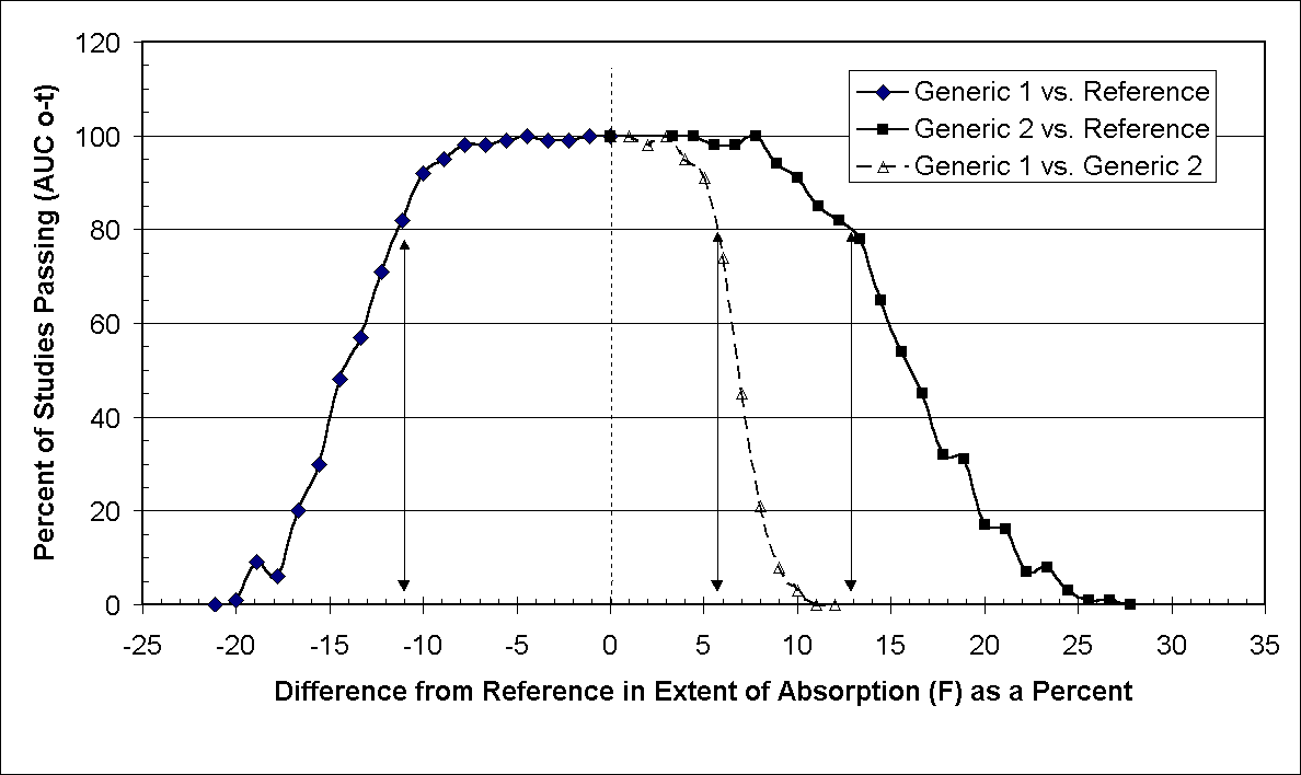 Figure 1. The percentage of studies that were observed to have their 95% CI fall completely between 80 and 125% as a function of the T/R ratio (%) in extent of absorption (F), expressed as the difference from reference, when reference is anchored at 1 or 100% [if FGeneric = 0.85 and FReference = 0.90, the ratio = 0.944 or 94.4% and the difference = -5.6%]. Perpendicular lines with arrows show points at which 80% of the studies have 95% CI fall completely between 80 and 125%. The open triangles identify two generic products which differ from the reference by equal but opposite bioavailabilities. When Generic 1 is -6% from reference and Generic 2 is +6% from the reference, while both would be bioequivalent to the reference (~98% of studies between Generic 1 and Reference or Generic 2 and reference would pass) only 74% of studies evaluating Generic 1 vs. Generic 2 would be found to be bioequivalent. As this difference in bioavailability increases, the failure rate also increases. When Generic 1 is -11% from the reference, and Generic 2 is +11% from the reference, more than 80% of the studies would find either generic bioequivalent to the reference. However, at this point, 0% of studies would find the generic products equivalent to each other. Discussion Current criteria for bioequivalence can result in a new generic formulation being declared bioequivalent and interchangeable with a Canadian reference product. Subsequent market entries may also be declared bioequivalent and interchangeable with the same Canadian reference product (1). However, while bioequivalence of the first generic relative to the subsequent generic market entries is never tested and never declared, in practice, interchangeability between all generic products and the reference occurs. In this situation the possibility exist for two generic products, which are known to be bioequivalent to a reference formulation, to be bio-in-equivalent to each other. In this study we tested the tolerance of the current Canadian narrow therapeutic index criteria to the bioequivalence between generic products.The results of this study suggest that two generic warfarin formulations, both of which met the criteria for bioequivalence against a reference formulation, would not necessarily meet bioequivalence criteria if compared to each other. It is clearly seen that when a difference between 6 and 11% in bioavailability exists between the generic and the reference product, a generic warfarin formulation would have ³ 80% likelihood of passing. However if the same generic product was compared to another generic, with similar but opposite difference in bioavailability, the likelihood of the two generic formulations being bioequivalent to each other would be between 74 and 3%. It is in this range of 6-11%, that the generic would likely to be bioequivalent to a reference, but unlikely to be bioequivalent to an equally but oppositely divergent generic. When the bioavailability differs by less than 6%, the generic formulations should be bioequivalent to both the reference formulation and the other generic formulation. When the difference in bioavailability is greater than 13% the generic would not likely be shown to be bioequivalent to the reference or an equally and oppositely divergent second generic. Therefore, within a certain range of relative bioavailability there is danger that a warfarin product that passes current standards of bioequivalence, relative to a reference formulation, will not be bioequivalent to other generic warfarin formulations. Table 4. Table 3 Summary Results for 100 Simulated Generic 1 vs. Generic 2 Studies