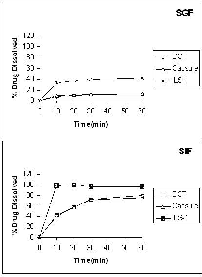 Figue 1: Dissolution profiles of indomethacin liquisolid compacts (ILS-1), conventional capsule and directly compressed tablets (DCT) at different dissolution media. Error bars are standard deviations for at least 3 determinations.