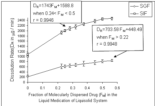 In order to investigate the effect of fraction of the dissolved or molecularly dispersed of indomethacin (FM) in the liquid medication of the prepared liquisolid tablets on the dissolution rates of the drug from liquisolid compacts, conventional capsules and DC tablets, the FM was plotted against their corresponding DR values (Fig. 4).