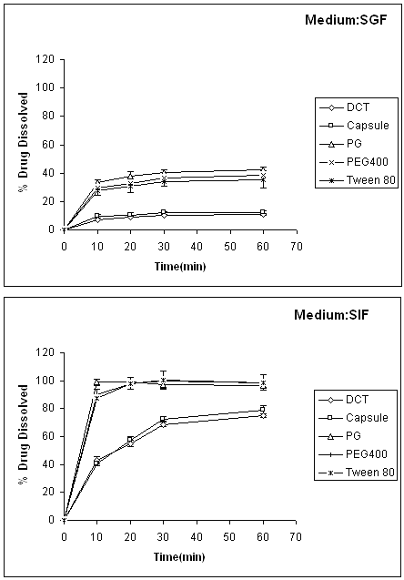 In vitro dissolution profiles of indomethacin showed that there was no significant difference (p > 0.05) between release rate of indomethacin from conventional tablet and capsule formulations at different pHs. Comparing the release profiles of indomethacin from liquisolid compacts and conventional dosage forms showed that the liquisolid formulations produced the highest dissolution rate at pH 1.2 and 7.2. Figure 1 also showed that the amount of drug release at pH 7.2 (SIF) is greater than those of released at pH 1.2 (SGF). This is due to the higher solubility of indomethacin at higher pH value (Table 2). The reason for an increase in dissolution rate of indomethcin from liquisolid compact can be explained by solubility data (Table 2). The solubility of indomethacin in SGF, SIF, propylene glycol, PEG 400 and Tween 80 is given in Table 2.