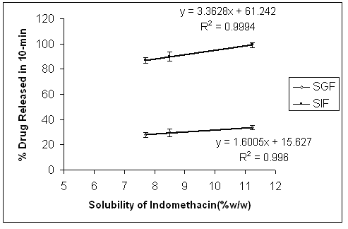 Figure 6: Regression lines showing the linear relationship between drugs released (%) and the solubility of indomethacin. Error bars are standard deviations for at least 3 determinations.