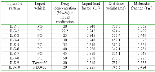 Table 1: Key formulation characteristics of prepared indomethacin liquisolid compacts.