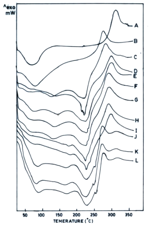 Figure 2: DSC thermograms of chitosan powder (A), chitosan acetate film (B) and chitosan (4% w/v) films cross-linked by various concentrations of sodium citrate (% w/v) without adjustment to pH 5 (C-1%, D-5%, E-10%, F-15%, G-20%) and sodium citrate solutions after adjustment to pH 5 (H-1%, I-5%, J-10%, K-15%, L-20%). All films were hydrated at 37°C (RH 45%).