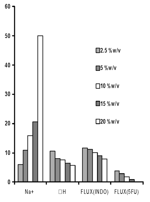 Figure 3: Sodium content (Na+, mg/film), third endothermic DH (J/g) and permeation of 5-FU (mg/h/cm2 X 10-2 ) and INDO (mg/h/cm 2 X 10-1 ) across chitosan films prepared with different concentrations of sodium citrate solutions without pH adjustment.