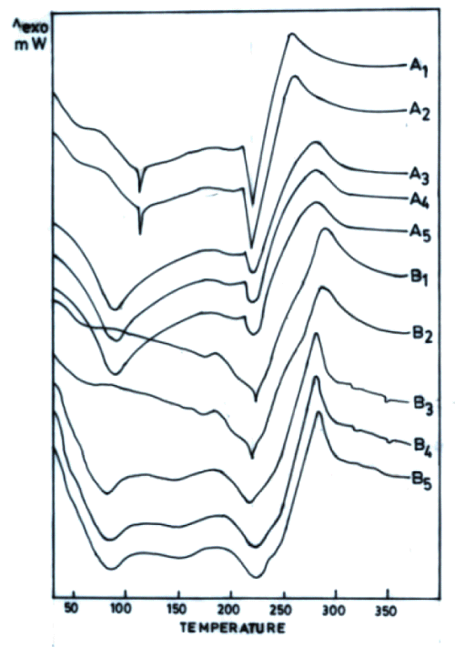 Figure 5: DSC thermograms of chitosan (4% w/v) films cross-linked with various concentrations sodium citrate (% w/v) without pH adjustment (A) and after adjustment to pH 5 (B) followed by dipping in phosphate buffer pH 7.4 for 48 h. [A1, B1-1%, A2, B2-5%, A3, B3-10%, A4, B4-15%, A5, B5-20%].