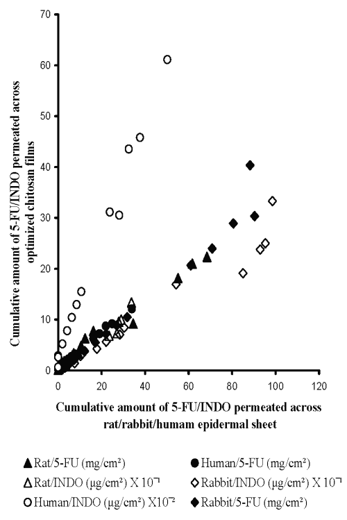 Figure 6: Correlation between in vitro permeation of 5-FU across optimized chitosan films and rat epidermal sheet (Y = 0.31X +1.07, R2 = 0.98, n=5), rabbit epidermal sheet (Y = 0.39X - 1.17, R2 = 0.96, n=5) or human cadaver epidermal sheet (Y = 0.35X + 0.59, R2 = 0.99, n=5) and INDO across optimized chitosan films and rat epidermal sheet (Y = 0.33X + 0.25, R2 = 0.96, n=5), rabbit epidermal sheet (Y = 0.28X - 0.37, R2 = 0.95, n=5) or human cadaver epidermal sheet (Y = 1.16X + 0.25, R2 = 0.99, n=5).