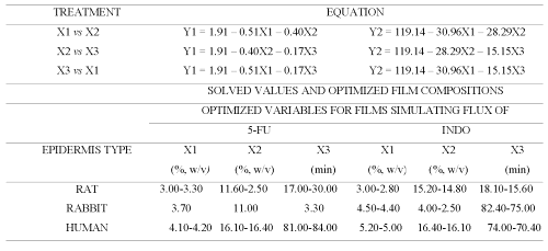 Permeation of both drugs across additional films (Table 3) prepared according to central composite design (CCD) was studied and the data obtained was used for generating equations for optimizing the film formulation (Table 4) in order to mimic the flux of both drugs across animal and human epidermal sheets (Table 5).