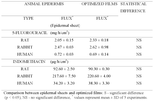 It is important to note that the optimized values for preparing chitosan films capable of simulating the flux of either drug are different for epidermal sheets of different animals. This indicates that a single chitosan film with a particular optimized composition cannot be used for simulating drug permeation across all types of epidermis. This can be attributed to the different inherent permeability of epidermis of different animals due to variation in their biochemical constituents, anatomical ultra structure, etc. Nevertheless, a high correlation evident from Figure 6 suggests that sodium citrate cross-linked chitosan films prepared by using their optimized composition can be used to simulate the in vitro permeation of 5-FU and INDO across rat, rabbit and human cadaver epidermal sheets.