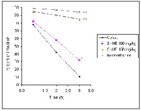 The SKHE and indomethacin were suspended in vehicle (1% CMC) and administered i.p. at a dose of 100 and 150 and 4 mg/kg respectively in a volume of 1.5-2 ml for each rat (6). Control group received vehicle (1 % CMC, 2 ml; i.p.). Tested compounds and vehicle alone were injected 30 min before the carrageenan injection and the degree of the carrageenan-induced swelling of the paw was measured for 3 h after carrageenan injection using a mercury plethysmograph (Ugo Basil, Italy).